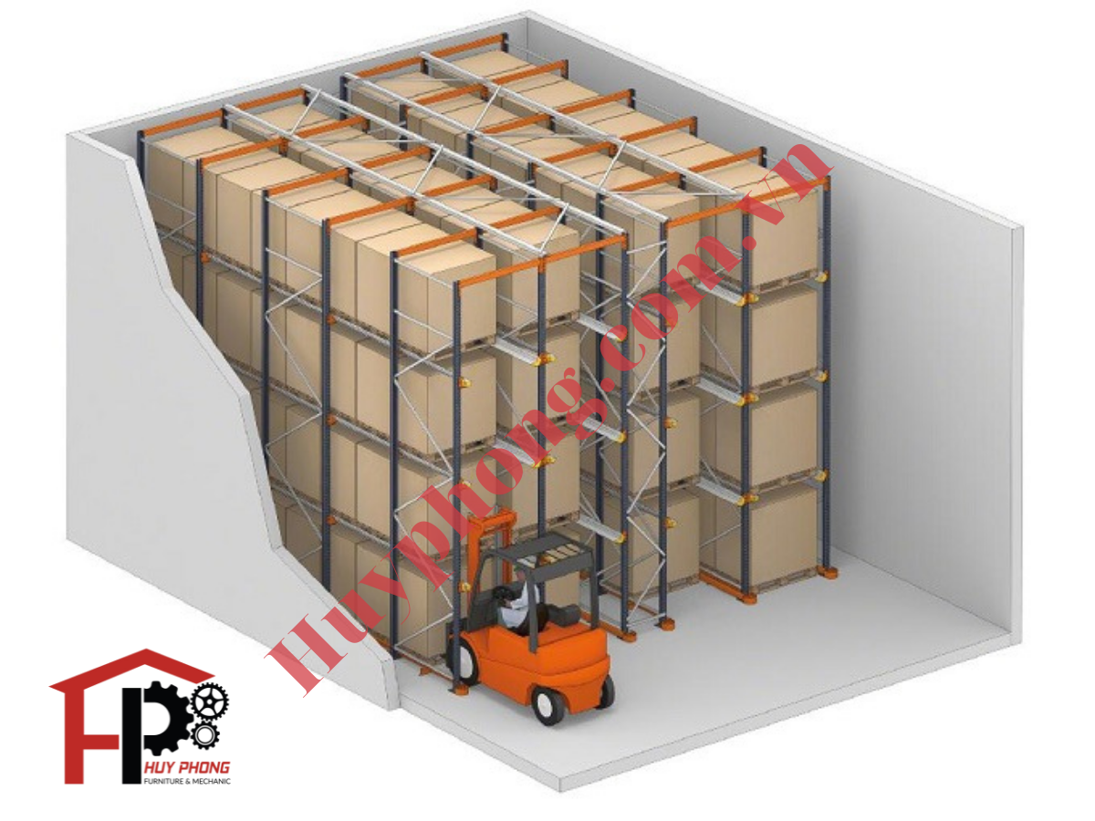 ✅ Kệ Drive -in với kết cấu có rãnh dẫn vào hoặc rãnh dẫn xuyên suốt.