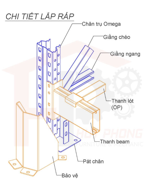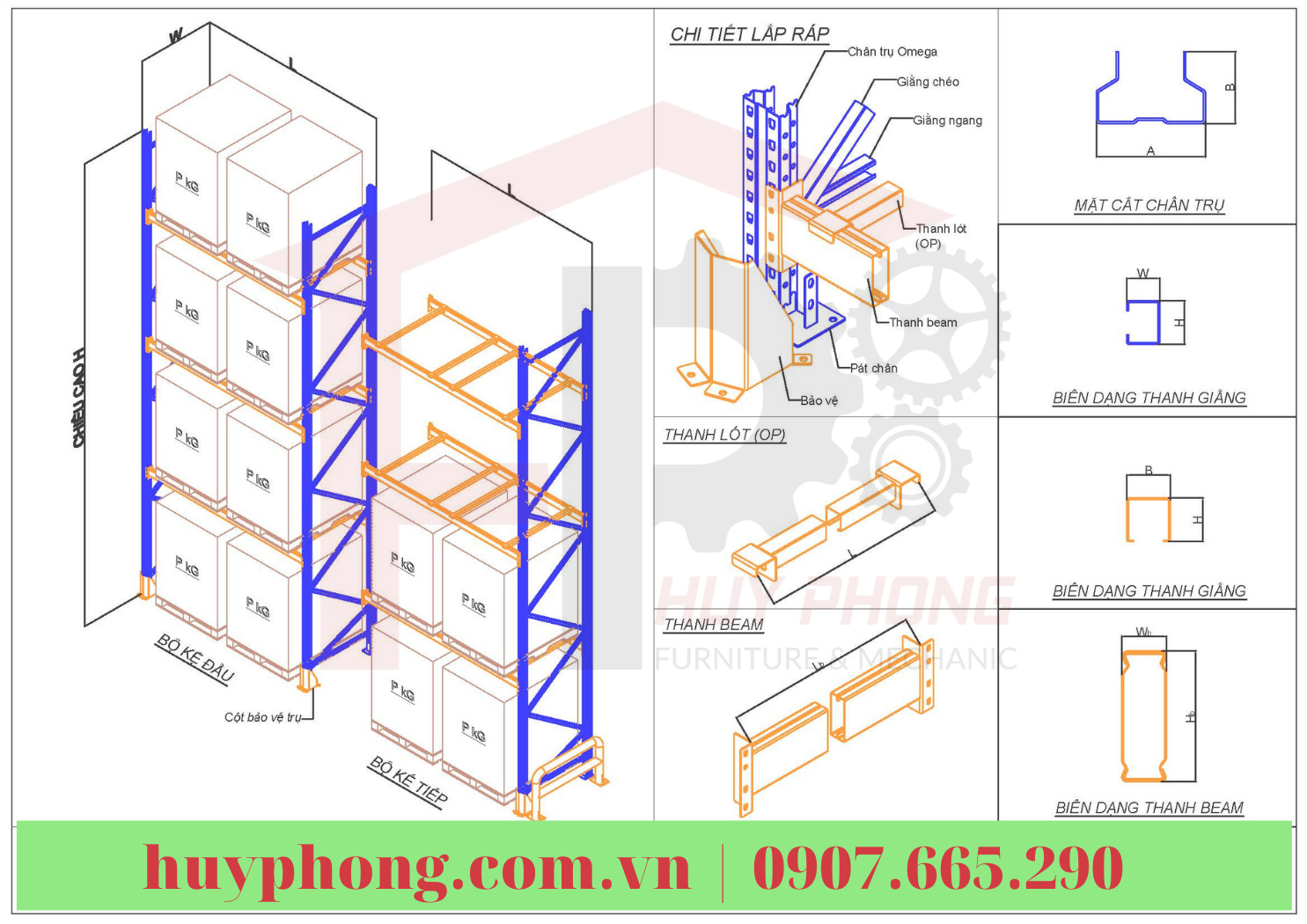 - Thanh trụ: chịu lực chính của kệ, có biên dạng Omega, kích thước được thiết kế phù hợp tải trọng theo yêu cầu.